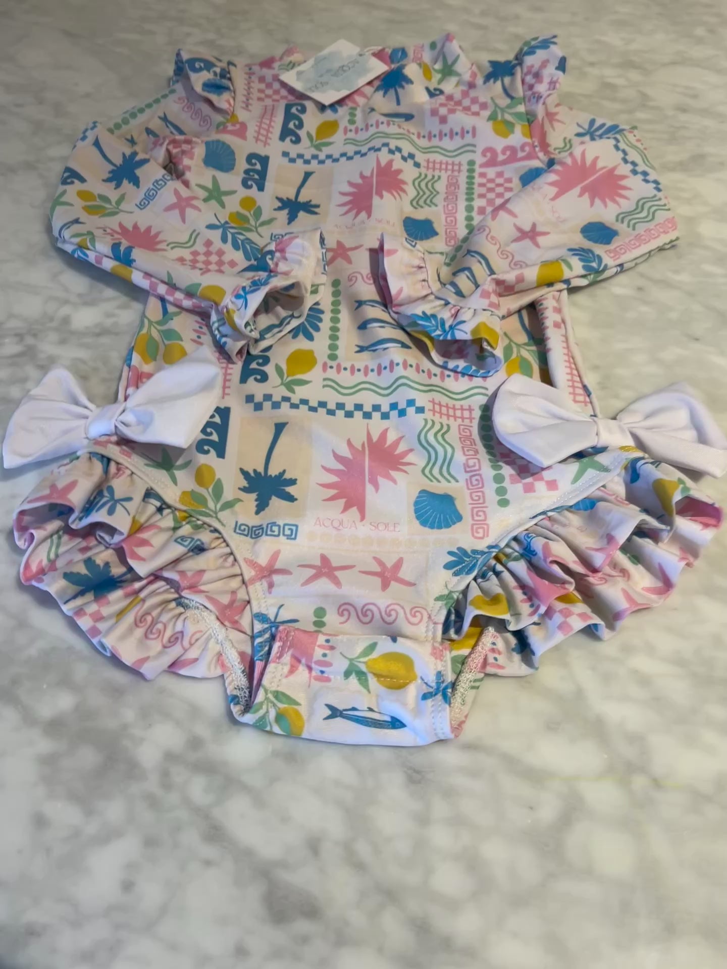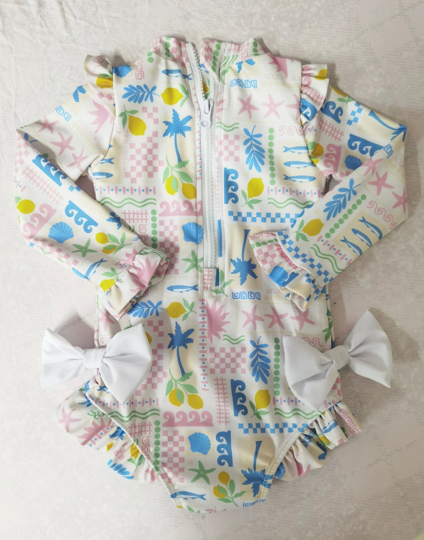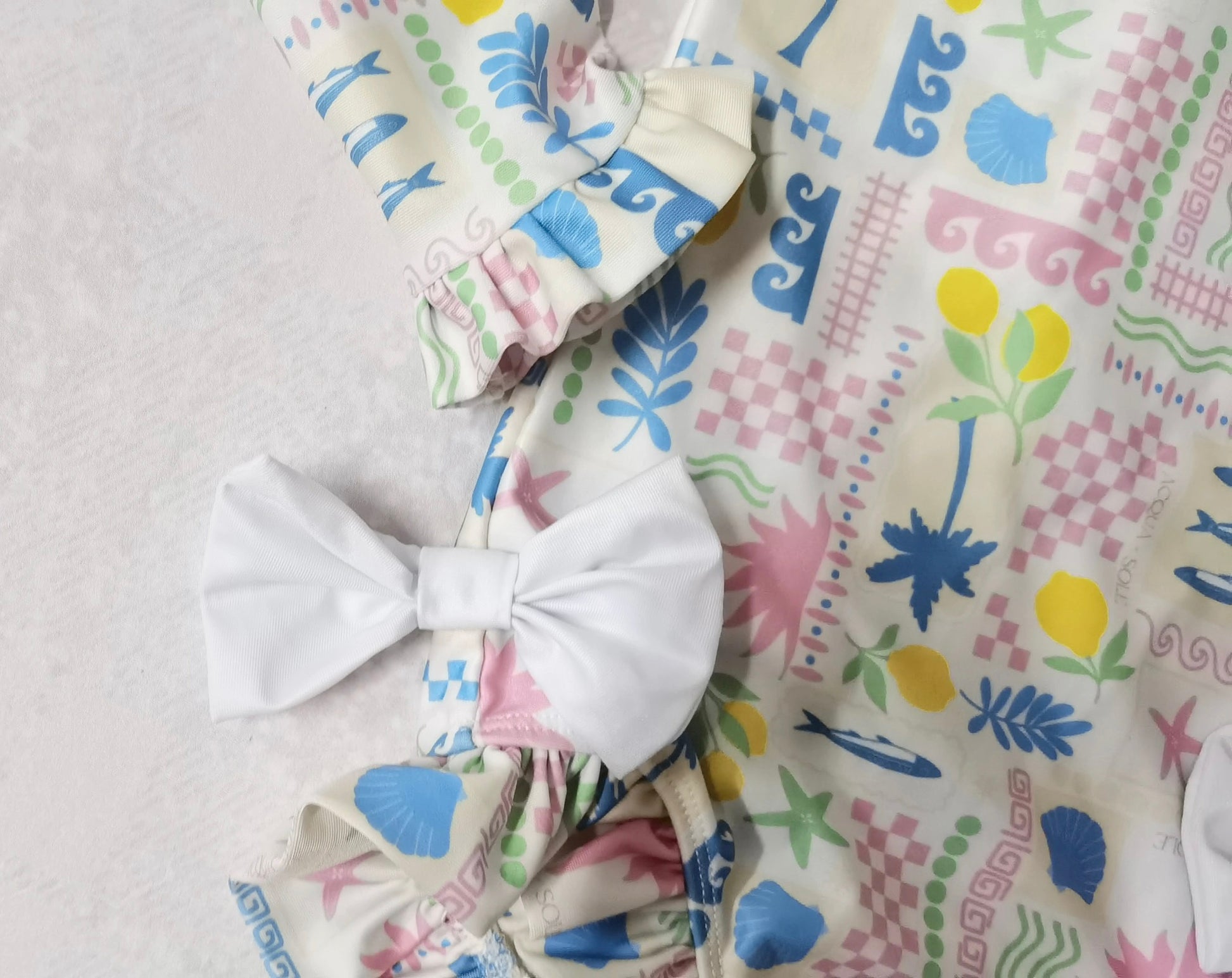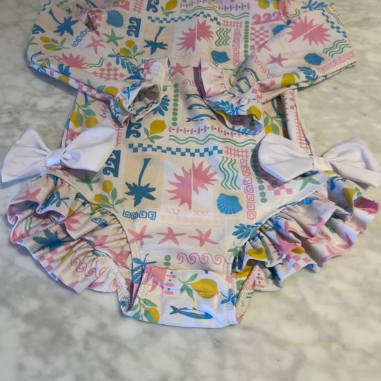 Inspired by the charm of coastal Italy, this print captures la dolce vita in every ruffle and wave. With soft pastels, seashell motifs, and flirty bows, Isola for Valentina is made for sun-soaked adventures and seaside strolls.