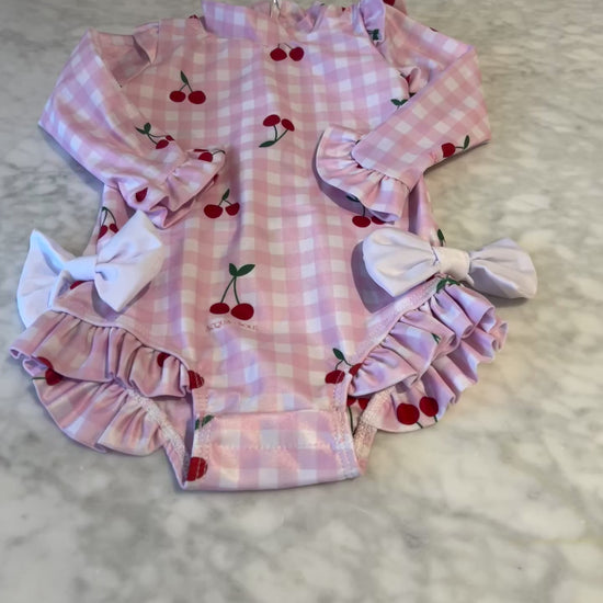 Inspired by sweet summer days and the playful charm of childhood, this print captures joy in every bow and cherry. With soft pink gingham, juicy cherry motifs, and frilly details, Cherries for Florence is made for sun-drenched adventures, twirls in the sand, and giggles by the sea.